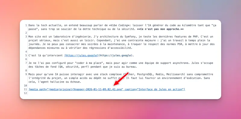 J'ai consacré une journée à l'intégration propre d'une galerie d'images dans un article Markdown. Non pas en raison d'une complexité technique — même si j'ai un certain goût pour la souffrance — mais par volonté d'éviter le syndrome du BBCode artisanal : une solution fonctionnelle l'espace d'un instant, mais qui, faute de documentation, devient un cauchemar de maintenance six mois plus tard.